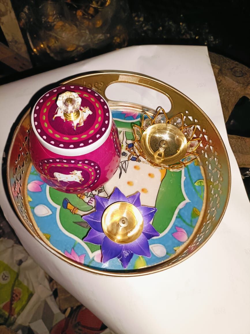 This beautiful Pichwai metal tray with jar diya adds a traditional and festive touch to your home. The tray features classic Pichwai-inspired artwork that reflects Indian culture and heritage This beautiful Pichwai metal tray with jar diya adds a traditional and festive touch to your home. The tray features classic Pichwai-inspired artwork that reflects Indian culture and heritage A Pichwai Metal Tray with Jar Diya is a beautiful blend of traditional artistry and functional décor. Inspired by classic Pichwai motifs, the intricately designed metal tray serves as an elegant base for the jar diya, making it perfect for festive rituals, pooja settings, or home décor. The rich detailing and antique finish reflect timeless Indian craftsmanship, while the jar diya adds a warm, serene glow to any space. Ideal for Diwali, special occasions, or as a thoughtful gift, this piece brings a touch of heritage, devotion, and sophistication to your home.